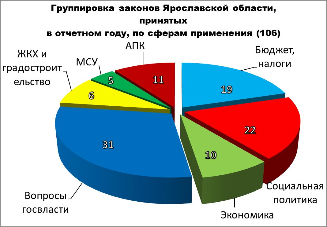 Принято 106 (в 2015 году - 116) законов, 394 (в 2015 году - 391) постановления. Из принятых законов 83 (78,3 %) внесены Губернатором Ярославской области, 18 (17 %) - депутатами Ярославской областной Думы, 2 – представительными органами местного самоуправления (ок. 2 %), 1 (ок. 1 %)– прокурором Ярославской области, 1 –Губернатором Ярославской области совместно с прокурором Ярославской области (ок. 1 %), 1 (ок. 1 %) –Избирательной комиссией Ярославской области.